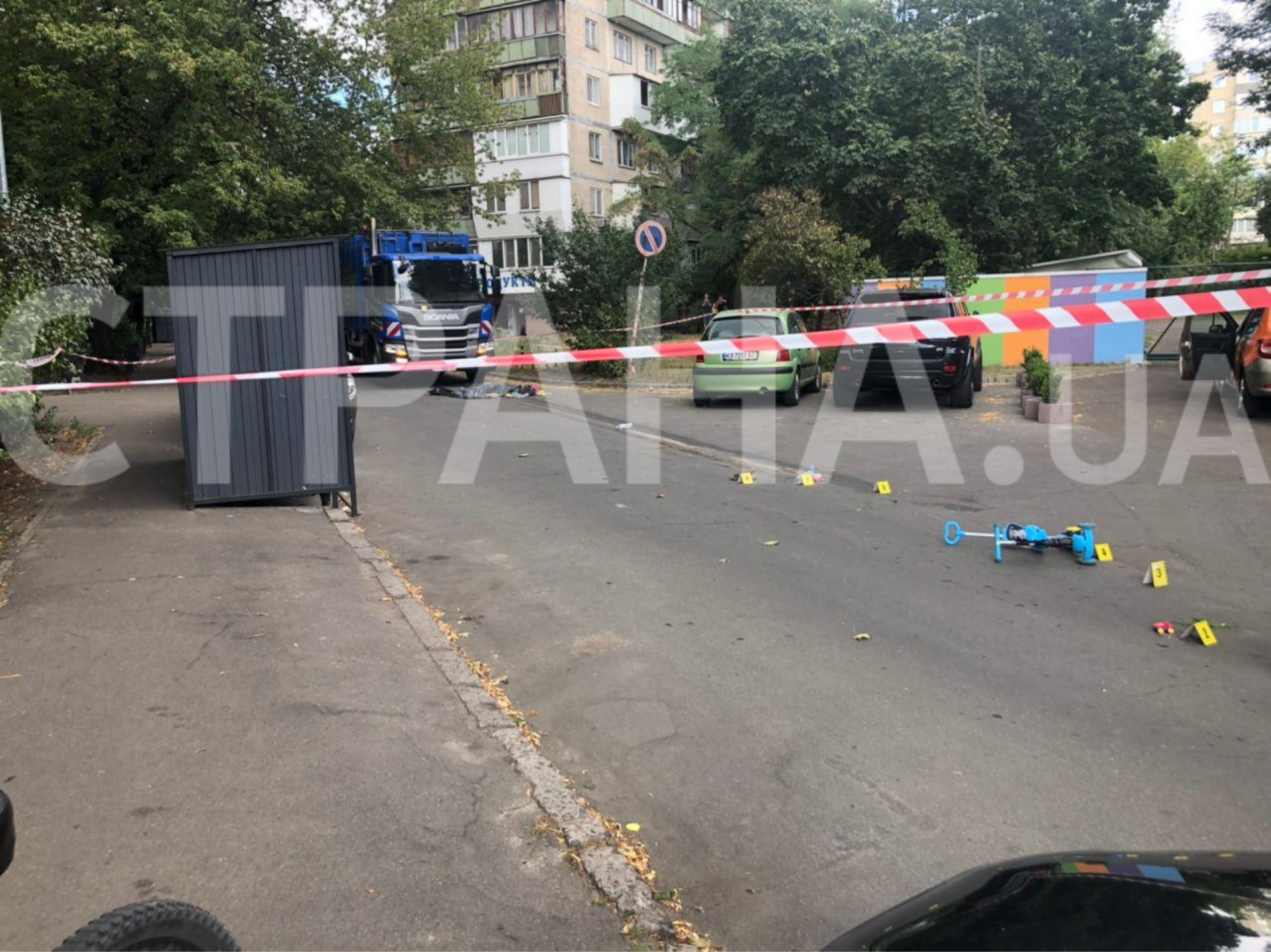 Возле самоката - место, где водитель наехал на ребенка, труп женщины мусоровоз протащил 7 метров
