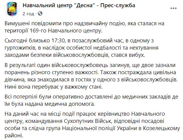 На территории 169-го военного учебного центра "Десна" в понедельник вечером произошел взрыв. Он прогремел в одном из общежитий. В результате взрыва один военный погиб, двое военных получили травмы.