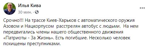 "Срочно!!! На трассе Киев-Харьков с автоматического оружия Азовом и Нацкорпусом расстрелян автобус с людьми. На нем передвигались члены нашего общественного движения "Патриоты - За Жизнь". Есть погибшие. Несколько человек похищены преступниками", - написал Илья Кива и добавил фото с места событий.