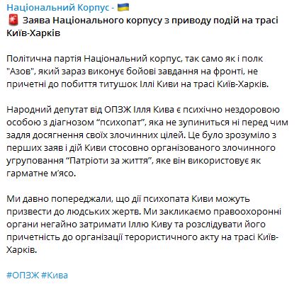 "Только что под Харьковом, на трассе Киев – Харьков, был заблокирован автобус, который перевозил людей из организации "Патриоты - За жизнь!". Заблокирован людьми, принадлежащими к группам "Азов" и "Национальный корпус". Данные бандформирования, остановив людей, расстреляли автобус с автоматического оружия, нанеся тяжелые пулевые ранения гражданским лицам.