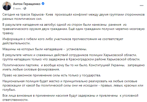 Позже замглавы МВД Антон Геращенко заявил, что "Патриотов" атаковали представители другой политической силы, не уточнив, какой именно. Также он заявил о трех пострадавших. Интересна риторика замминистра - оказывается, имело место не нападение, а "конфликт".