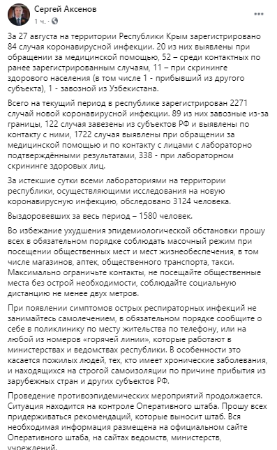 "За 27 августа на территории Республики Крым зарегистрировано 84 случая коронавирусной инфекции. 20 из них выявлены при обращении за медицинской помощью, 52 - среди контактных по ранее зарегистрированным случаям, 11 - при скрининге здорового населения (в том числе 1 - прибывший из другого субъекта), 1 - завозной из Узбекистана", - написал Аксенов.