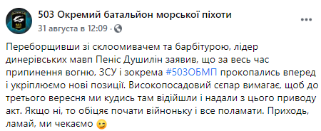 Высокопоставленный сепар требует, чтобы до 3 сентября мы куда-то там вышли и предоставили по этому поводу акт. Если мы этого не сделаем, то обезьяний вожак обещает, что начнет войнушку, придет и все поломает. Приходи, ломай, мы ждем!", - написали в Фейсбуке батальона 31 августа.