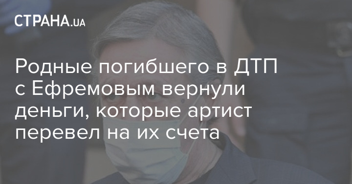 Родственники Сергея Захарова, погибшего в ДТП с участием Михаила Ефремова, вернули артисту деньги, которые он перевел на их счета в качестве компенсации. Речь идет о сумме по 200 тысяч рублей  (около 75 тысяч гривен) для каждого пострадавшего. Об этом сообщил адвокат потерпевших, передает телеграм-канал Mash.