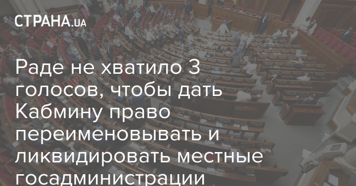 В Верховной Раде не нашлось достаточного количества голосов, чтобы предоставить Кабинету министров полномочия создавать, реорганизовывать и переименовывать местные государственные администрации. За соответствующие изменения в законодательство проголосовали 223 народных депутата при 226 необходимых.