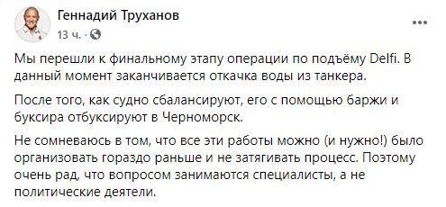"Мы перешли к финальному этапу операции по подъёму Delfi. В данный момент заканчивается откачка воды из танкера.После того, как судно сбалансируют, его с помощью баржи и буксира отбуксируют в Черноморск.