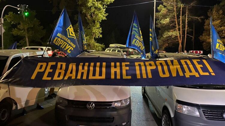 Растяжка на заборе резиденцииМитингующие националистыАнтикапитулянты у дома ЗеленскогоУ резиденции собрались протестующие
