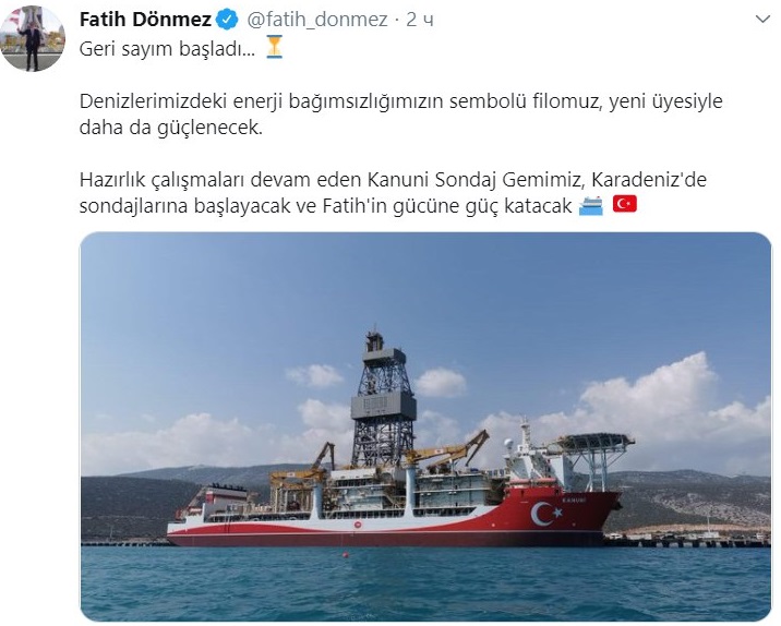 "Обратный отсчет начался. Наш флот, символ нашей энергетической независимости в наших морях, станет сильнее с его новым членом. Наше буровое судно Kanuni, подготовительные работы которого продолжаются, продолжит поиск, бурение, пока не станем нетто-экспортером. Наша цель очевидна. Мы будем защищать наши права при любых условиях", - указано в сообщении.
