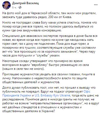 "Специально для аваковских экспертов: проводка в доме была вся новая, во время когда все горело на кухне где находилась мать горел свет, газ к дому не подключен. Пока дом еще горел, а пожарники его тушили, соответствующие службы уже составили акт что "все произошло из за короткого замыкания". Через пару часов дом потушили и "службы" уехали. Некоторые соседи утверждают, что примерно во время возгорания видели "евробляху", быстро уезжающую из села (машин в селе там не много)", - написал Василец в Facebook.