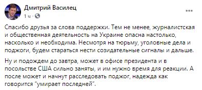 "Вдруг на поджог отреагирует Офис президента Украины и Посольство США в Украине, тогда есть шанс на расследование. Понятное дело, я никогда гранты не получал, не работал на всякие "неправительственные организации", но, а вдруг нет двойных стандартов в отношении к журналистам и общественным деятелям в Украине?" - написал Василец.