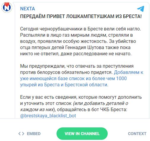 "Сегодня чернорубашечники в Бресте вели себя нагло. Распыляли в лицо газ мирным людям, стреляли в воздух, проявляли особую жестокость. За убийство отца пятерых детей Геннадия Шутова также пока никто не ответил, даже расследование не начато. Мы предупреждали, что отвечать за преступления против белорусов обязательно придется. Добавляем к уже имеющейся базе список из более чем 1000 упырей из Бреста и Брестской области", - говорится в сообщении Телеграм-канала.