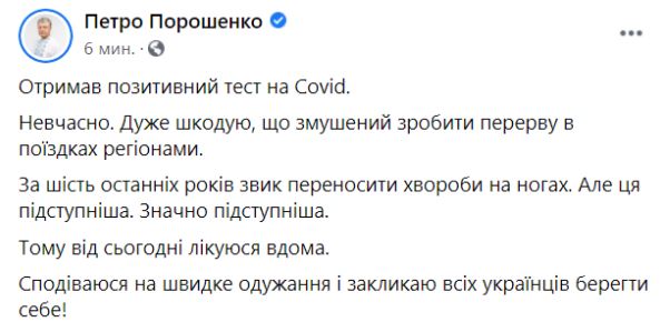 "Получил положительный тест на Covid. Не вовремя. Очень жалею, что вынужден сделать перерыв в поездках по регионам. За шесть последних лет привык переносить болезни на ногах. Но это коварнее. Намного коварнее. Поэтому с сегодняшнего дня лечусь дома. Надеюсь на скорейшее выздоровление и призываю всех украинцев беречь себя!" - написал он в Facebook.