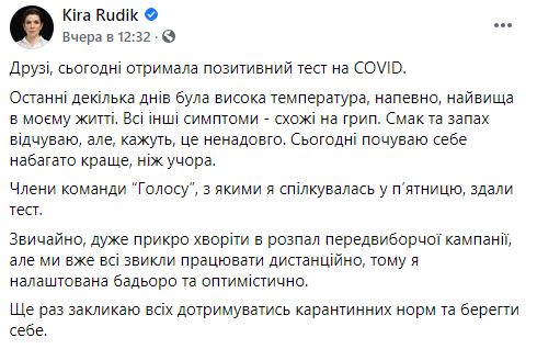 "Друзья, сегодня получила положительный тест на Covid. Последние несколько дней была высокая температура, наверное, самая высокая в моей жизни. Все остальные симптомы - похожи на грипп. Вкус и запах чувствую, но, говорят, это ненадолго. Сегодня чувствую себя гораздо лучше, чем вчера" - написала Рудык.