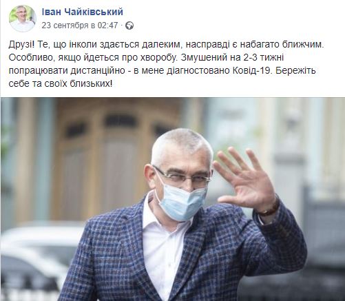 23 сентября о диагнозе сообщил член депутатской группы "За майбутне" Иван Чайковский. Он пробудет на самоизоляции 2-3 недели и будет работать дистанционно.