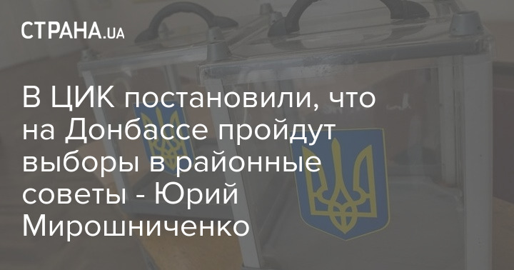 Представитель Центральной избирательной комиссии Юрий Мирошниченко заявил, что выборы в районные советы состояться по всей территории Украины, включая Донбасс (подконтрольную территорию - Ред.), где отменили выборы в другие местные органы самоуправления.