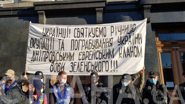 В среду, 14 октября, в День защитника Украины и День УПА в Киеве националисты провели Марш УПА. В самом его конце представители "Правого сектора", "Нацкорпуса" и "Свободы" около здания Офиса президента поставили антисемитский плакат против главы государства Владимира Зеленского.
