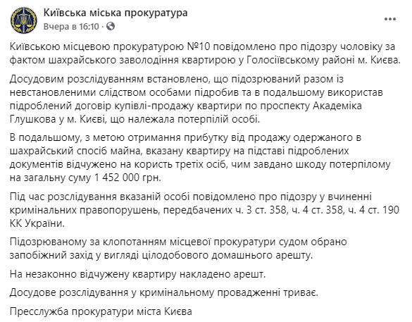 "Досудебным расследованием установлено, что подозреваемый вместе с неустановленными следствием лицами подделал и в дальнейшем использовал поддельный договор купли-продажи квартиры по проспекту Академика Глушкова в г. Киеве, принадлежавшей потерпевшему. В дальнейшем, с целью получения прибыли от продажи полученного мошенническим способом имущества, указанную квартиру на основании поддельных документов отчуждено в пользу третьих лиц, чем нанесен ущерб потерпевшему на общую сумму 1 452 000 грн", - говорится в сообщении.