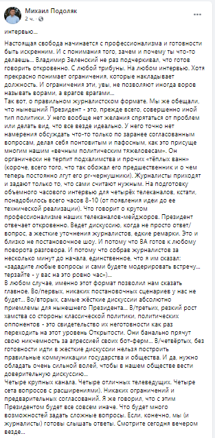 Советник главы Офиса президента, политтехнолог Михаил Подоляк в Facebook заявил, что интервью Зе - это новый формат. Новизна в том, что согласованных заранее вопросов не будет.