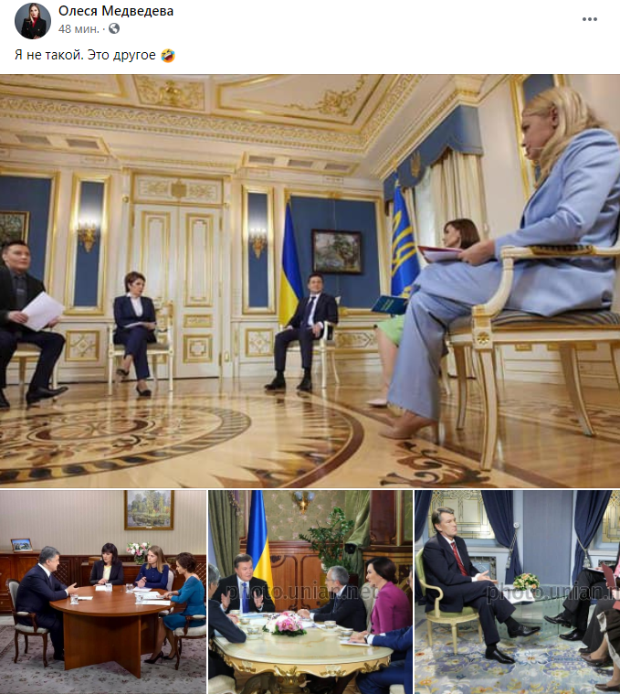 "Я не такой. Это другое", - написала в ФБ автор блога "Ясно.Понятно" Олеся Медведева и опубликовала фото с идентичных интервью других украинских президентов - Януковича, Ющенко и Порошенко.