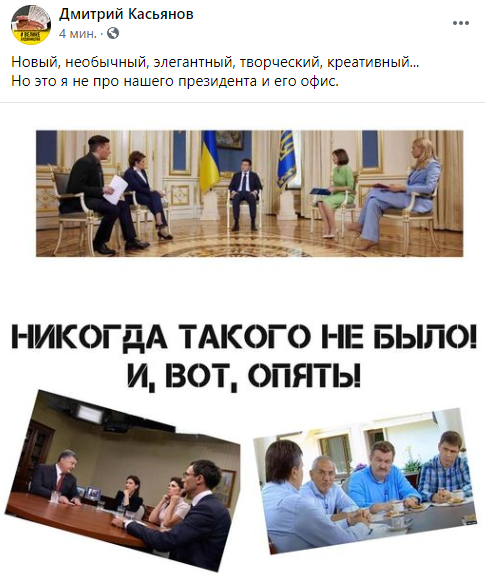 "Новый, необычный, элегантный, творческий, креативный... Но это я не про нашего президента и его офис", - подписал он.