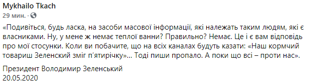 "Посмотрите, пожалуйста, на средства массовой информации, принадлежащих таким людям, которые являются собственниками. Ну, у меня ведь нет теплой ванны? Правильно? Нету. Это и есть вам ответ о моих отношениях. Когда вы увидите, что на всех каналах будут говорить: "Наш кормчий товарищ Зеленский смог пятилетку" ... Тогда пиши пропало. А пока все - против нас", - говорил тогда президент.