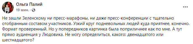 "Не зашли Зеленскому ни пресс-марафоны, ни даже пресс-конференции с тщательно отобранным составом участников. Узкий круг подневольных людей куда приятнее, конечно. Формат проверенный. Но у попередников картинка была поприличнее как по мне. А тут прямо аудиенция у Людовика. Не могу определиться, какого: двенадцатого или шестнадцатого?", - интересуется журналистка Ольга Палий.