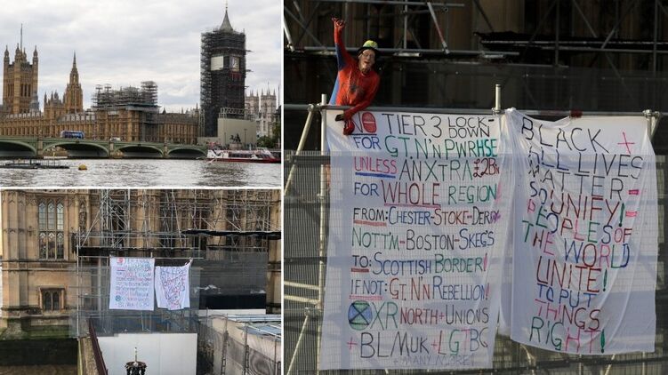 Оказавшись на башне, протестующий вывесил на лесах два плаката. "Никакого локдауна третьего уровня на севере, если только всему региону не будут выделены еще два миллиарда фунтов стерлингов... иначе восстание" и "Черные и все жизни имеют значения".