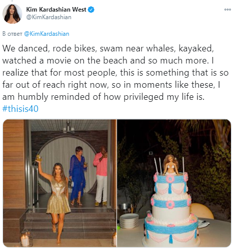 "Я удивила своих близких поездкой на частный остров, где мы могли ненадолго притвориться, что все нормально. Мы танцевали, катались на велосипедах и байдарках, плавали возле китов, смотрели фильмы на пляже и я понимаю, что для большинства людей это сейчас недостижимо, поэтому в такие моменты мне смиренно напоминают о том, насколько привилегированна моя жизнь", - подытожила свой день рождения сама Ким Кардашьян.