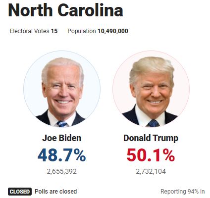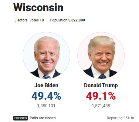 Здесь подсчитано 95% голосов и Байден опережает Трампа на 0,6%. Тоже очень хрупкое преимущество.