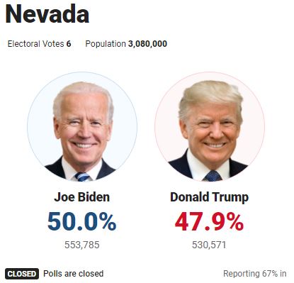 Согласно предварительным данным, в Неваде за Байдена проголосовали 588 252 человек (49,3%), за Трампа - 580 605 (48,7%). Там посчитали пока 75% голосов.