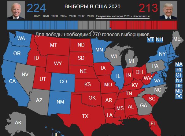 Байден набирает 264 голоса выборщиков из 270 необходимых. У Трампа 214 голосов.