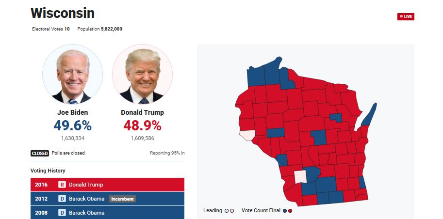 Несмотря на победные реляции Байдена, в Висконсине ещё не подсчитали официально 100% голосов.