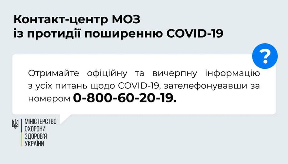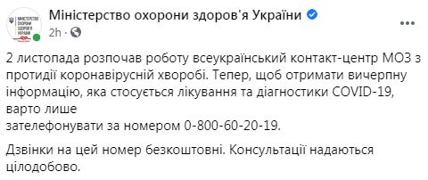 "2 ноября начал работу всеукраинский контакт-центр Минздрава по противодействию коронавирусной болезни. Теперь, чтобы получить исчерпывающую информацию, касающуюся лечения и диагностики COVID-19 стоит только позвонить по номеру 0-800-60-20-19, - говорится в сообщении.