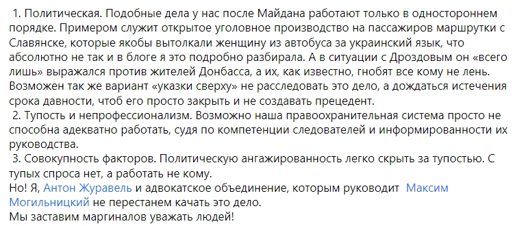 "Подобные дела у нас после Майдана работают только в одностороннем порядке. Примером служит открытое уголовное производство на пассажиров маршрутки с Славянске, которые якобы вытолкали женщину из автобуса за украинский язык, что абсолютно не так и в блоге я это подробно разбирала. А в ситуации с Дроздовым он "всего лишь" выражался против жителей Донбасса. Возможен так же вариант "указки сверху" не расследовать это дело, а дождаться истечения срока давности, чтоб его просто закрыть и не создавать прецедент", - написала спецкор "Страны".
