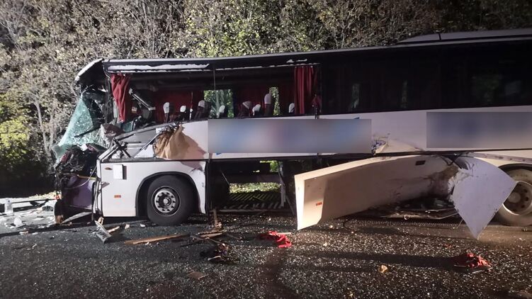 В результате столкновения водитель рейсового автобуса от полученных травм погиб на месте происшествия. Его 22-летняя пассажирка госпитализирована в больницу. Остальные не пострадали.