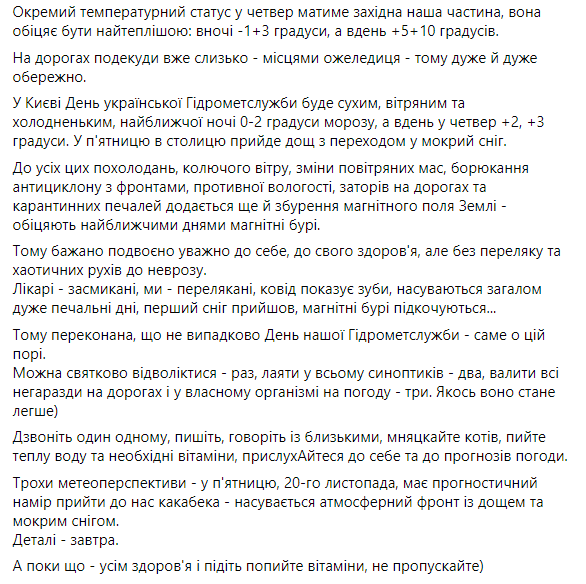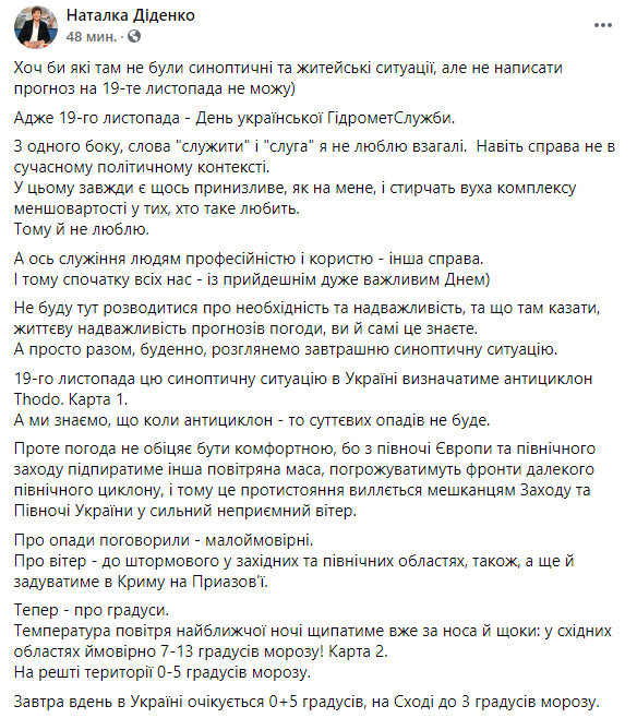 Об этом сообщает синоптик Наталья Диденко на своей странице в Facebook.
