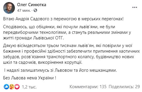 Сегодня Садовой опубликовал тревожный пост о заговоре. По его словам, ТИК неожиданно назначил первое заседание Львовского горсовета уже на завтра (когда победа Садового ещё не будет официально объявлена).
