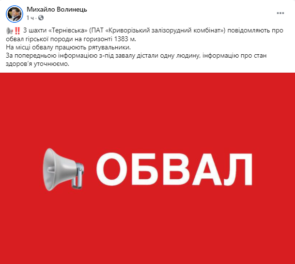 "Из шахты "Терновская" (ПАО "Криворожский железорудный комбинат") сообщают об обвале горной породы на горизонте 1383 м. На месте обрушения работают спасатели. По предварительной информации из-под завала достали одного человека, информацию о состоянии здоровья уточняем", - написал Волынец.