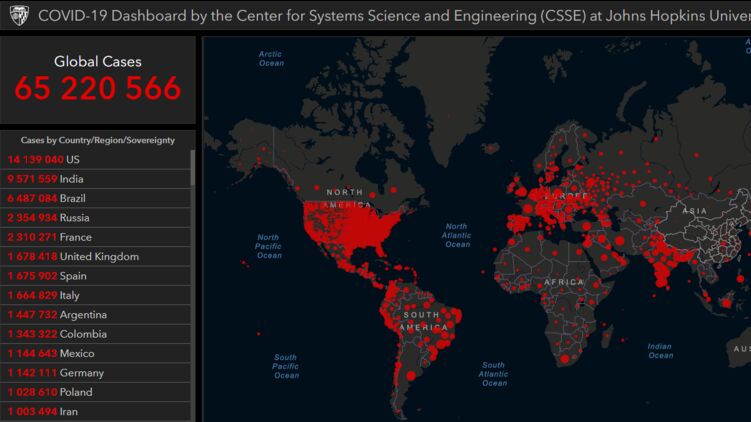 По данным на 4 декабря, число зараженных в мире превысило 65 миллионов человек, фото: arcgis.com