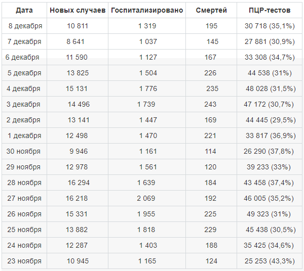 Сравним последние пять дней (среднее время для получения ПЦР-теста) и предыдущую пятидневку. С 4 по 8 декабря сделали 184 473 теста. А накануне - 190 957. То есть тестов было больше, а заболевших стало меньше.