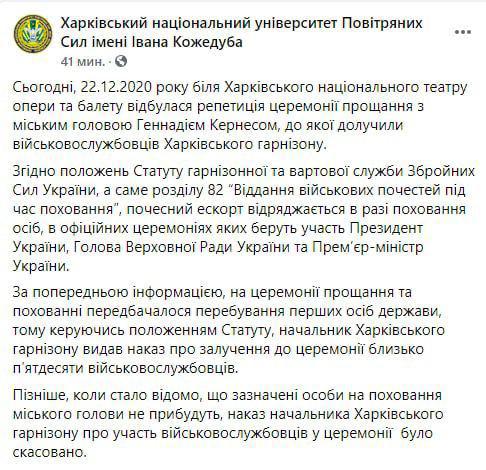 "По предварительной информации, на церемонии прощания и похоронах предполагалось пребывания первых лиц государства… Позже, когда стало известно, что указанные лица на погребение городского головы не прибудут, приказ начальника Харьковского гарнизона об участии военнослужащих в церемонии был отменен", - говорится в сообщении университета.