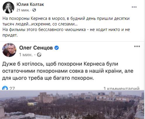 12:50 "Очень бы хотелось, чтобы похороны Кернеса были окончательными похоронами совка в нашей стране, но для этого надо еще много похорон" - написал Олег Сенцов.