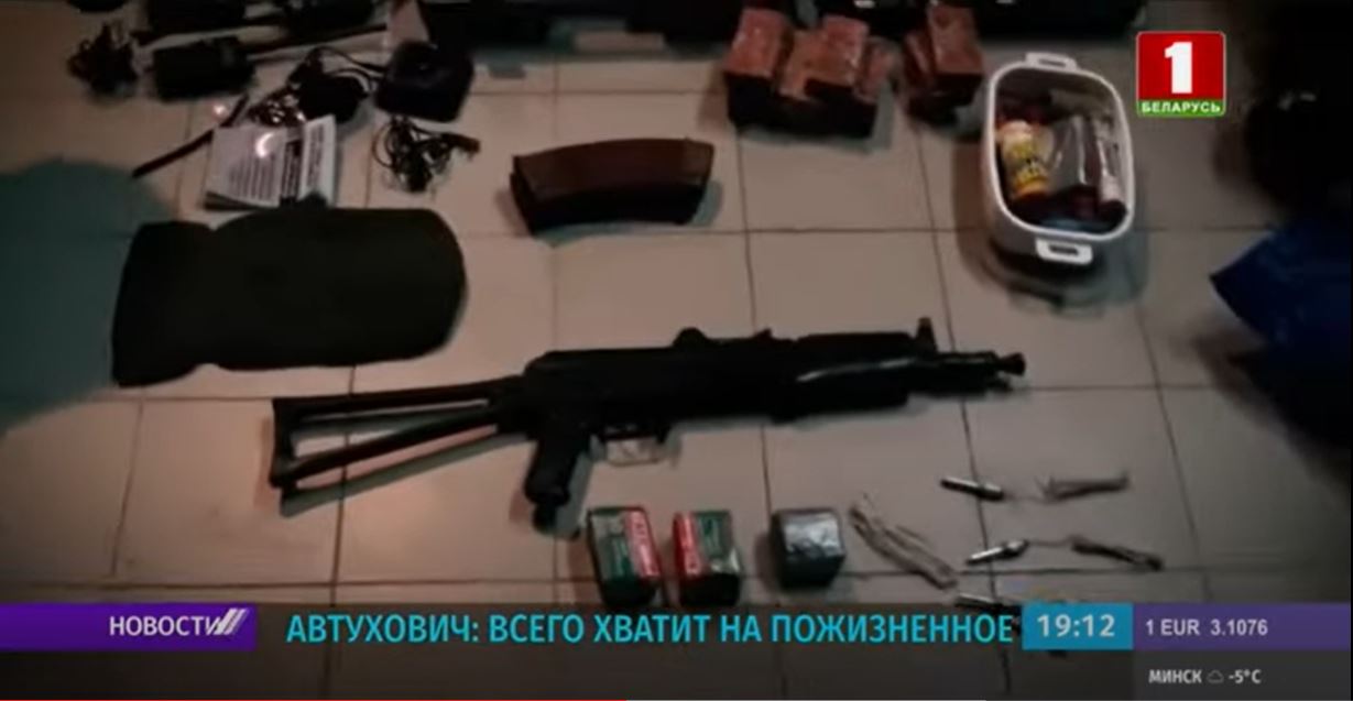 Белорусское ТВ сообщило имена задержанных: Олиневич (известен как бывший политзаключенный), Дубовский, Резанович и Романов. У них нашли "две единицы огнестрельного оружия с боеприпасами, боевую ручную гранату, травматический пистолет с патронами, холодное оружие и баллончики с перцовым газом, форму и рюкзаки военного образца, палатки, саперную лопату, топор, фонари".
