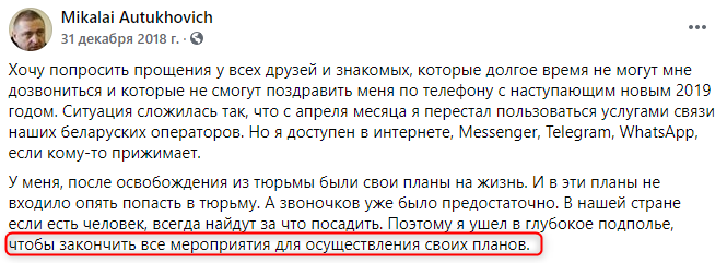 Оппозиционные СМИ Беларуси сообщают, что в последние два года он старался "не светиться": редко был на мобильной связи и старался не пользоваться интернетом со своего ноутбука. А в Фейсбуке он заявлял, что "ушел в глубокое подполье ради осуществления своих планов".