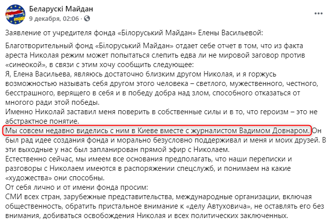 "Экс-политузник Николай Автухович с соратниками, которые и без внимания СМИ точно не пребывают в "овощном существовании", - писал "Белорусский Майдан" 6 декабря, за два дня до задержания активиста.