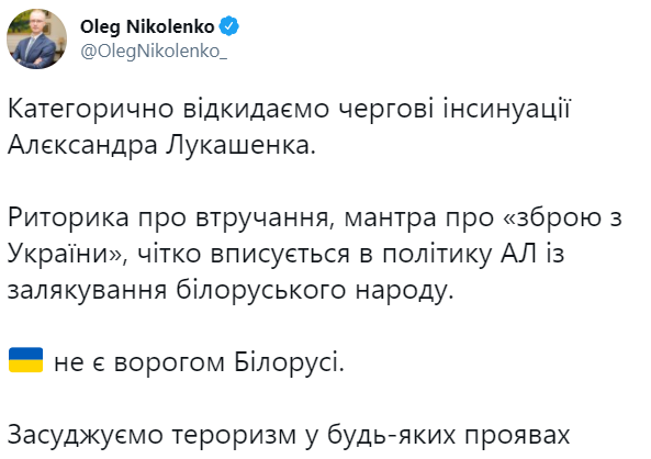 В МИД Украины после заявлений Лукашенко начали их опровергать: спикер ведомства Олег Николенко написал твит следующего содержания: