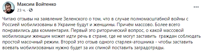 "Читаю отзывы на заявление Зеленского о том, что в случае полномасштабной войны с Россией мобилизованы в Украине будут и женщины. Причём массово. Более всего понравились два комментария. Первый - это риторический вопрос, о какой массовой мобилизации женщин может идти речь в стране, где не могут заставить граждан соблюдать простой масочный режим. Второй - это отзыв одного старлея-атошника - чтобы заставить воевать мобилизованых, нужно будет за их спиной поставить заградотряды", - пишет журналист Максим Войтенко.