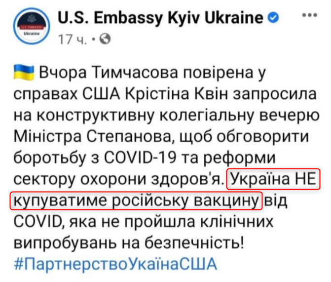 Позволить Украине покупать вакцину "страны-агрессора" означало подвергнуть сомнению официальную доктрину о разрыве Киева с Москвой. К тому же американцы, судя по всему, рассчитывали сохранить за собой украинский рынок медицинских закупок.