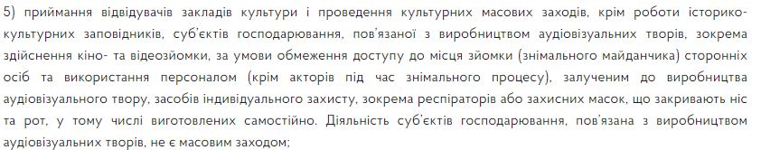 А вот кино- и видеосъемку разрешат при условии ограничения доступа к месту съемки и использовании масок персоналам. Требование к маскам не касается актеров в кадре.