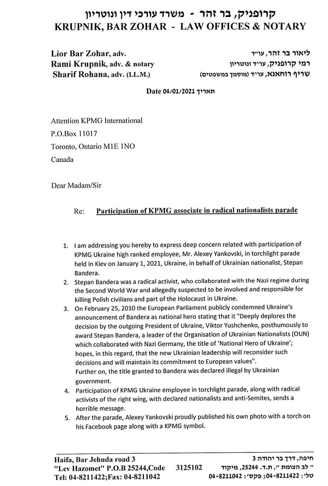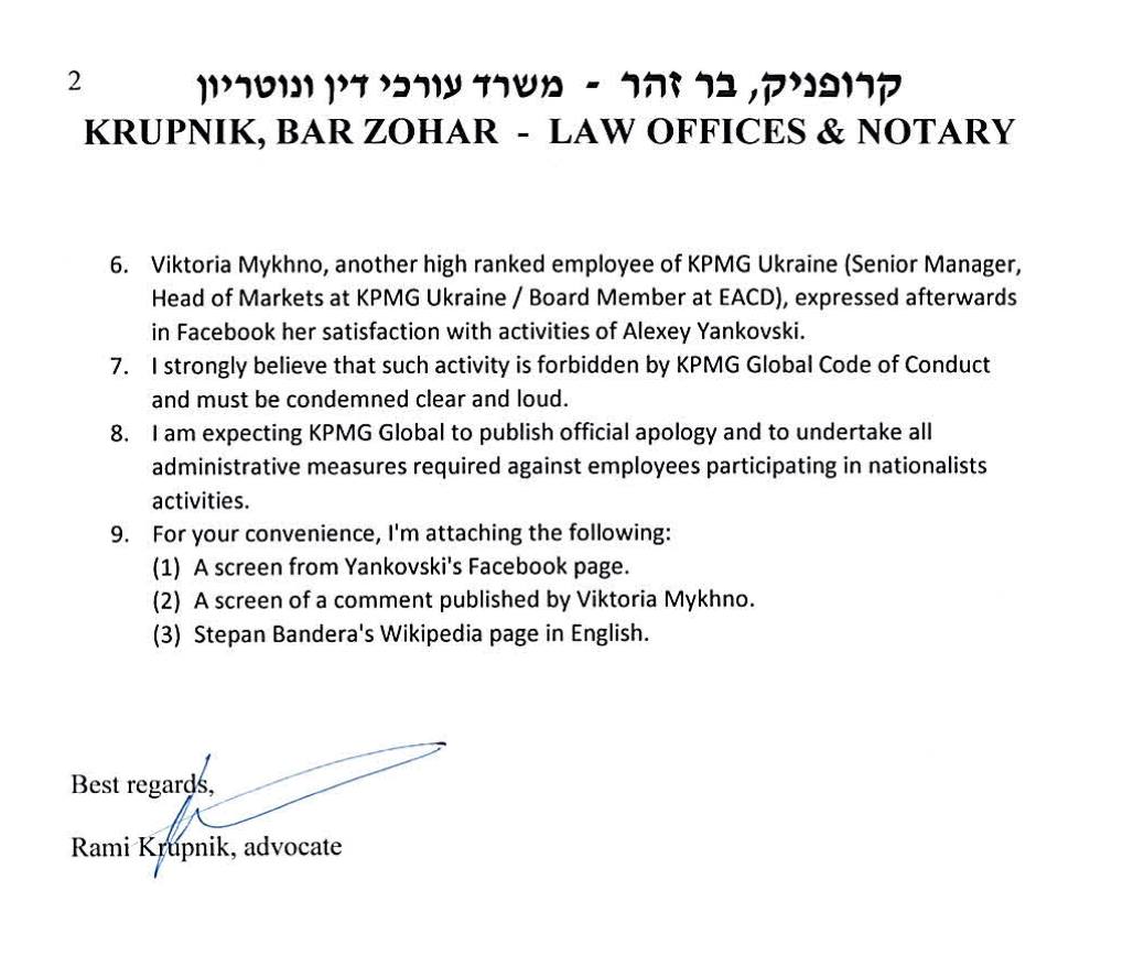 Израильский адвокат Рами Крупник направил письмо руководству международной консалтинговой компании KPMG в связи с участием партнера украинского офиса фирмы Алексея Янковского в националистическом марше в честь дня рождения Степана Бандеры.